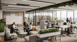 次に、コミュニケーションを自然に誘発するオープンエリアの構築です。まるで洗練されたカフェにいるかのようなリラックスできる空間は、偶発的なアイデアの創出やチームの絆を深める役割を果たします。コクヨのラウンジチェアーや木目調の大型テーブルを配置し、観葉植物をふんだんに取り入れたバイオフィリックデザインを採用することで、視覚的な癒やしと心地よさを演出できます。自然光がたっぷり入る窓際にリフレッシュスペースを設けることも、気分転換を図る上で絶大な効果を発揮します。